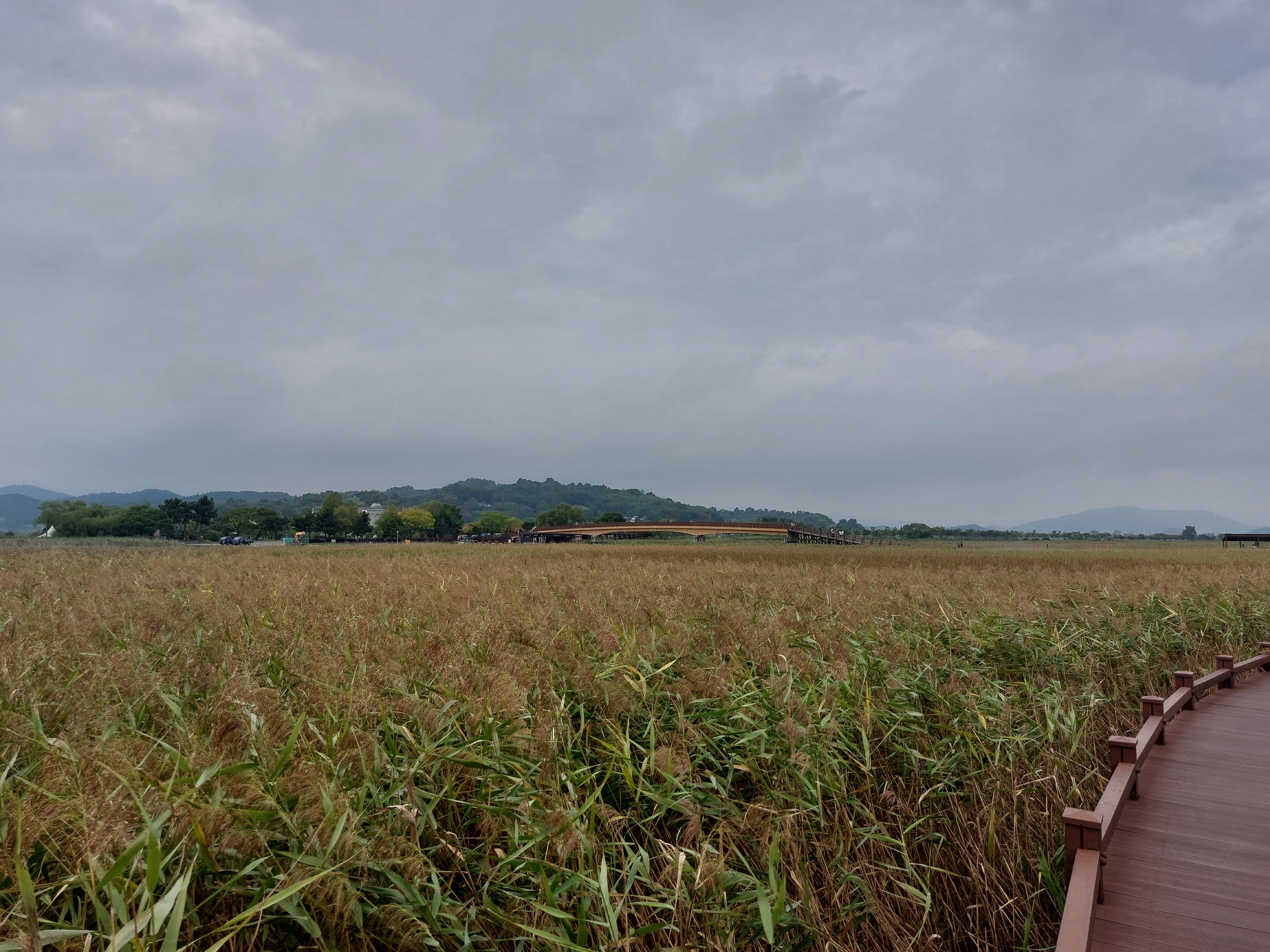 순천만습지의 첫 느낌은 우리나라에서도 이렇게 넓은 평원을 볼 수 있나 하는 것이었습니다. 습지여서 순전한 육지와는 좀 다르기는 하지만, 드넓게 펼쳐져 있는 갈대밭 습지야말로 산지가 많은 우리나라에서는 좀처럼 보기 힘든 광경이라는 느낌이었습니다. 평일이어서 근런지 사람들이 많지 않았는데, 그나마도 입구 가까이에는 사진을 찍는 사람들이 꽤 있었는데 점점 갈수록 사람이 없어지고 나중에는, '여기가 마지막 화장실'이라는 이상한 표지가 있는 건물에 다다랐을 때에는 저희밖에 남지 않았습니다. 그 표지판에서는 또 '여기서 용산전망대까지 왕복 40분'이라는 글이 쓰여 있어서 고민을 하게 많들었습니다. 잠깐 고민 후 기왕 여기까지 온 거 전망대를 가보기로 결정하였습니다.