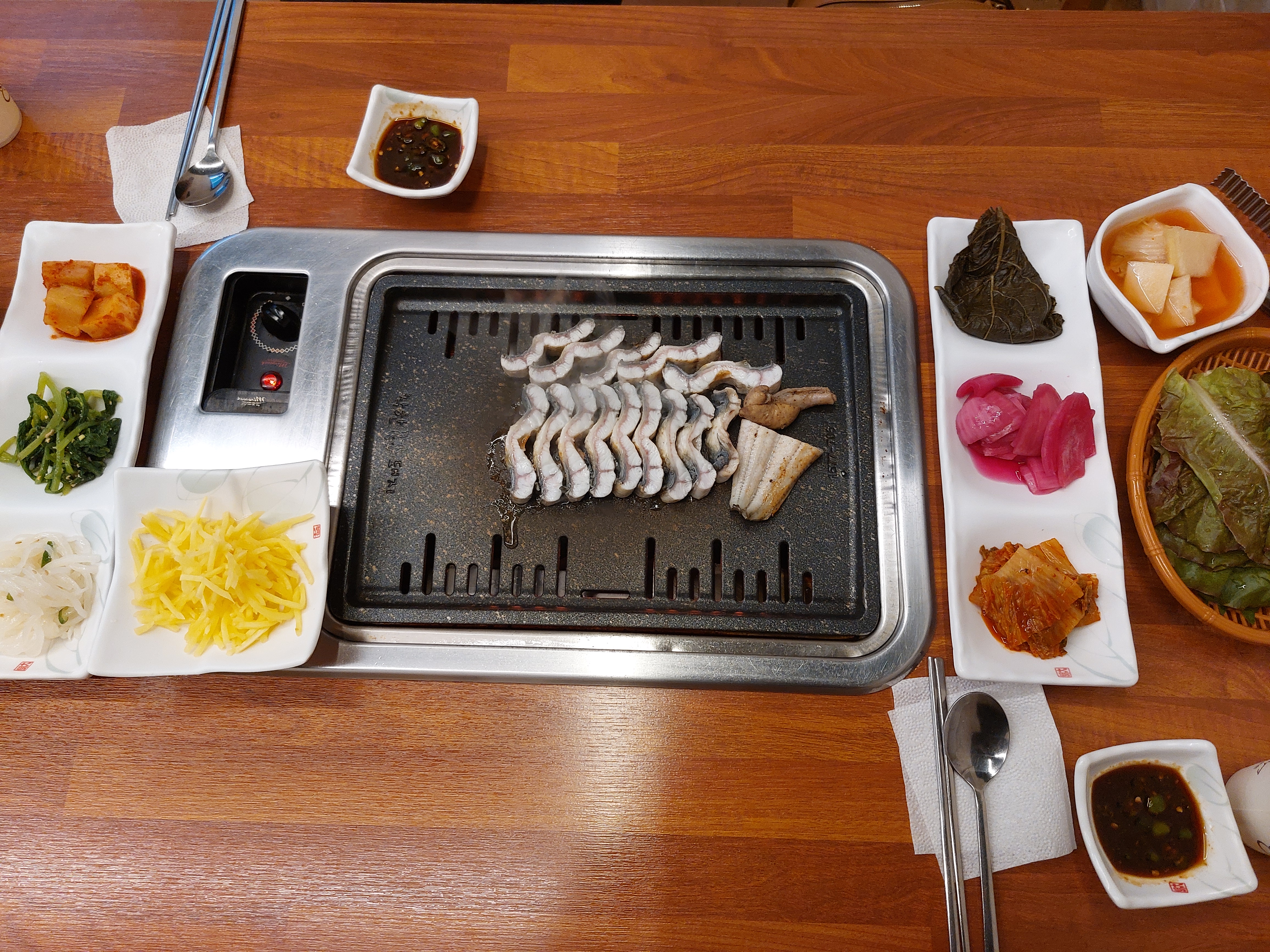 서빙을 보시는 분은 3인분을 권하였지만, 저희는 배가 고프지는 않아 민물장어 2인분만 주문하였습니다. 사진을 보면 양이 많지 않은데, 실제로도 많지 않습니다. 맛은 괜찮았고, 적당히 익을 때까지 계속 봐주시기 때문에 편리하였습니다. 특이하게 적당한 시간을 타이머로 정해놓아서 그때그때 와주셔서 구워주셨습니다.